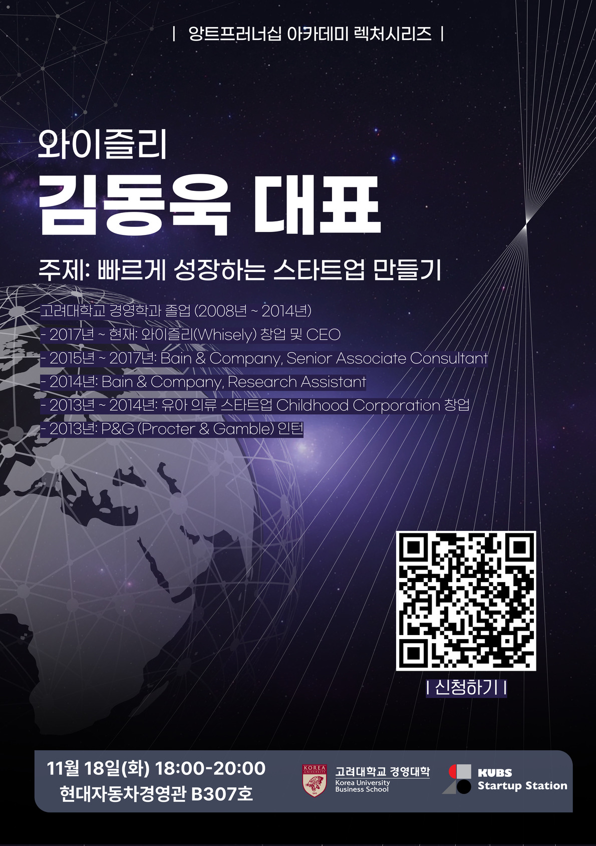 [강연 정보] 일시: 2025.11.18(화) 18:00~20:00 장소: 고려대학교 현대자동차경영관 지하3층 B307호(코오롱 강의실) 연사: 와이즐리 김동욱 대표 주제: 빠르게 성장하는 스타트업 만들기 문의: kubsstartup@korea.ac.kr, (스타트업연구원) /02) 3290-2799, 1699 [강연 신청 방법] ✔KU 창업종합포털-Program에서 사전 신청
